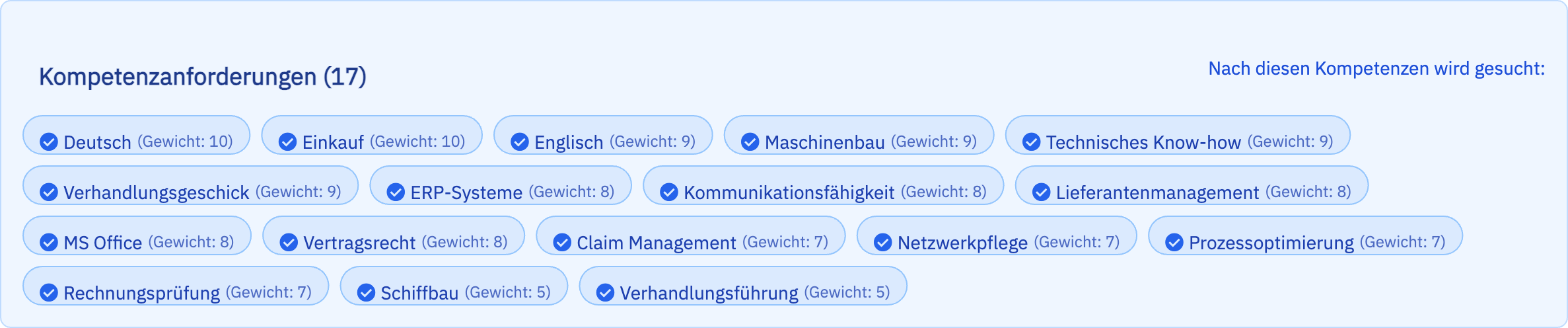 Ganz oben sieht du, welche Kompetenzen aus der Anfrage herangezogen werden – inklusive Gewicht (5–10):
