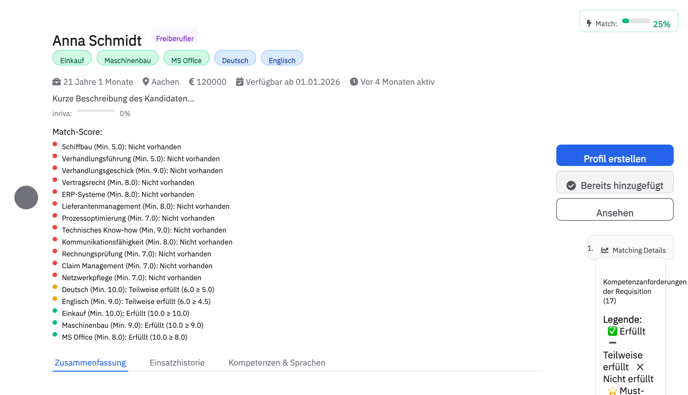 | inriva Score | 🟠 Orange | Kulturelle Übereinstimmung (manuelle Bewertung im Kandidatenprofil) |