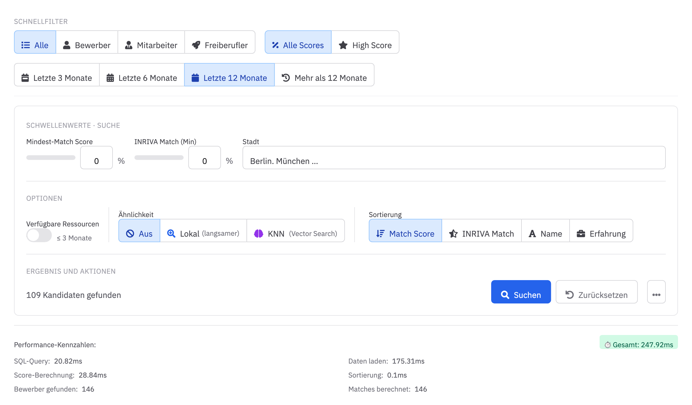 - Mindest-Match-Score (0–100 %) – blendet alle Kandidaten unter diesem Wert aus.